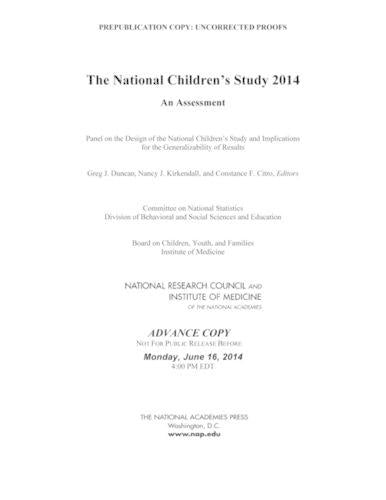 In response, the Program Office implemented a number of pilot tests in 2011 to evaluate alternative recruitment methods and pilot testing continues to date. At the request of Congress, The National Children's Study 2014 reviews the revised study design and proposed methodologies for the NCS Main Study. This report assesses the study's plan to determine whether it is likely to produce scientifically sound results that are generalizable to the United States population and appropriate subpopulations. The report makes recommendations about the overall study framework, sample design, timing, content and need for scientific expertise and oversight. The National Children's Study has the potential to add immeasurably to scientific knowledge about the impact of environmental exposures, broadly defined, on children\'s health and development in the United States. The recommendations of this report will help the NCS will achieve its intended objective to examine the effects of environmental influences on the health and development of American children.